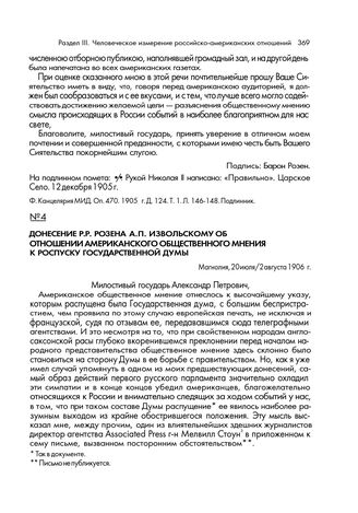 Донесение Р.Р. Розена А.П. Извольскому об отношении американского общественного мнения к роспуску Государственной думы. Магнолия, 20 июля/2 августа 1906 г. // Ф. Канцелярия МИД. Оп. 470. 1906 г. Д. 143. T. 1. Л. 204-206. Подлинник.