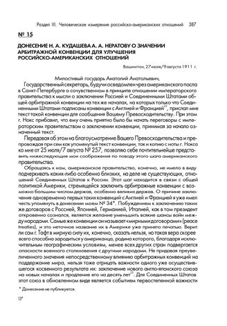 Донесение Н.А. Кудашева А.А. Нератову о значении арбитражной конвенции для улучшения российско-американских отношений. Вашингтон, 27 июля/9 августа 1911 г. // Ф. Канцелярия МИД. Оп. 470. 1911 г. Д. 133. Л. 137-140. Подлинник.
