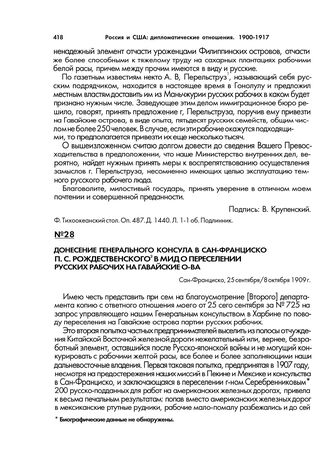 Донесение генерального консула в Сан-Франциско П.С. Рождественского в МИД о переселении русских рабочих на Гавайские о-ва. Сан-Франциско, 25 сентября/8 октября 1909 г. // Ф. Тихоокеанский стол. Оп. 487. Д. 1440. Л. 3-7об. Подлинник. 1 копия.