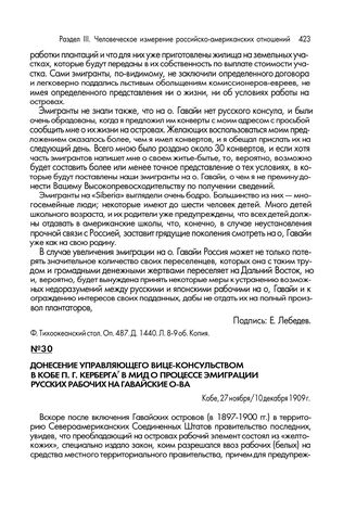 Донесение управляющего вице-консульством в Кобе П.Г. Керберга в МИД о процессе эмиграции русских рабочих на Гавайские о-ва. Кобе, 27 ноября/10 декабря 1909 г. // Ф. Тихоокеанский стол. Оп. 487. Д. 1440. Л. 11-1Зоб. Подлинник.