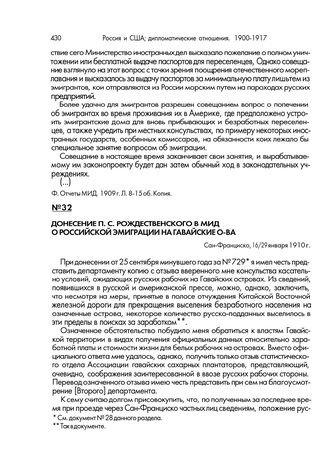 Донесение П.С. Рождественского в МИД о российской эмиграции на Гавайские о-ва. Сан-Франциско, 16/29 января 1910 г.