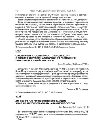 Отношение П.А. Столыпина А.П. Извольскому о выделении средств на возвращение российских переселенцев с Гавайских о-вов. Санкт-Петербург, 15/28 марта 1910 г.