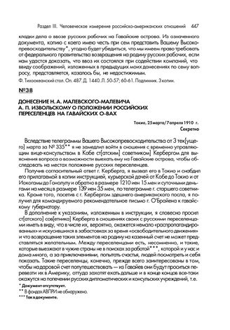 Донесение Н.А. Малевского-Малевича А.П. Извольскому о положении российских переселенцев на Гавайских о-вах. Токио, 25 марта/7 апреля 1910 г.