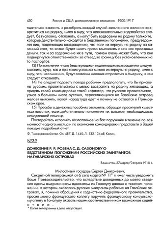 Донесение Р.Р. Розена С.Д. Сазонову о бедственном положении российских эмигрантов на Гавайских островах. Вашингтон, 27 марта/9 апреля 1910 г. // Ф. Тихоокеанский стол. Оп. 487. Д. 1440. Л. 135-136об. Подлинник.