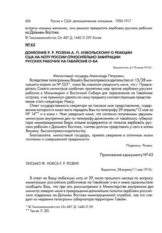 Донесение Р.Р. Розена А.П. Извольскому о реакции США на ноту России относительно эмиграции русских рабочих на Гавайские о-ва. Вашингтон, 6/19мая 1910 г.