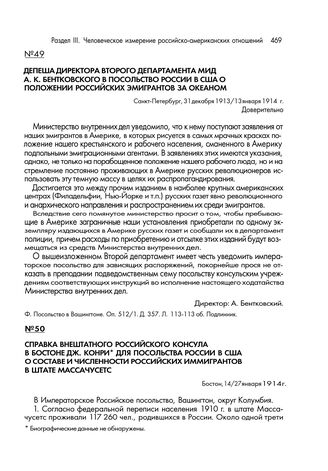Депеша директора Второго департамента МИД А.К. Бентковского в посольство России в США о положении российских эмигрантов за океаном. Санкт-Петербург, 31 декабря 1913 г./13 января 1914 г.