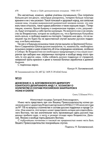 Донесение Н.В. Богоявленского директору Азиатского департамента МИД Г.А. Козакову о количестве и составе российских эмигрантов в Номе и Сиэтле. Сиэтл, 7/20 июня 1914 г. // Ф. Тихоокеанский стол. Оп. 487. Д. 1439. Л. 44-49об. Подлинник. 1 копия.
