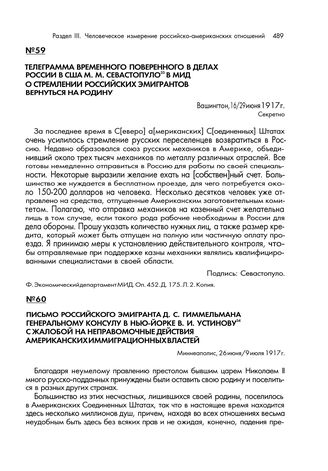 Телеграмма временного поверенного в делах России в США М.М. Севастопуло в МИД о стремлении российских эмигрантов вернуться на Родину. Вашингтон, 16/29 июня 1917 г.