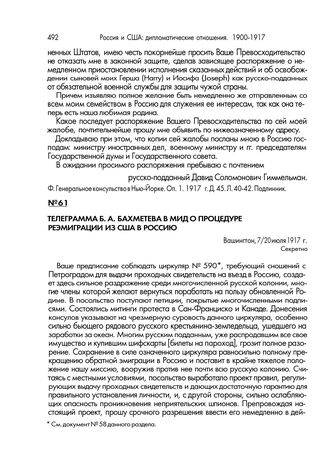 Телеграмма Б.А. Бахметева в МИД о процедуре реэмиграции из США в Россию. Вашингтон, 7/20 июля 1917 г. // Ф. Канцелярия МИД. Оп. 470. 1917 г. Д. 61. Л. 273-276. Копия.