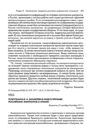 Телеграмма Б.А. Бахметева в МИД о призыве российских эмигрантов в армию. Вашингтон, 21 сентября/4 октября 1917 г. // Ф. Канцелярия МИД. Оп. 470. 1917 г. Д. 61. Л. 428-429. Копия.