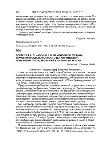 Донесение А.П. Кассини В.Н. Ламздорфу о решении Верховного суда по вопросу о дополнительной пошлине на сахар, ввозимый в Америку из России. Вашингтон, 15/28 января 1903 г. // Ф. Канцелярия МИД. Оп. 470. 1903 г. Д. 113. Л. 23-25 об. Подлинник.