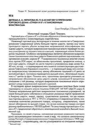 Депеша А.А. Нератова Ю.П. Бахметеву о претензиях торгового дома «Стукен и К°» к таможенным властям США. Санкт-Петербург, 7/20 июня 1913 г.