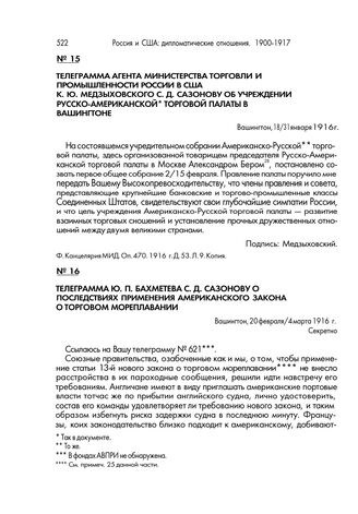 Телеграмма агента Министерства торговли и промышленности России в США К.Ю. Медзыховского С.Д. Сазонову об учреждении Русско-Американской торговой палаты в Вашингтоне. Вашингтон, 18/31 января 1916 г. // Ф. Канцелярия МИД. Оп. 470. 1916 г. Д. 53. Л. 9. Копия.