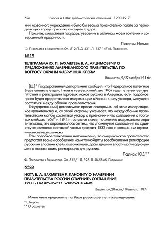 Нота Б.А. Бахметева Р. Лансингу о намерении правительства России отменить соглашение 1915 г. по экспорту товаров в США. Вашингтон, 28 июля/10 августа 1917 г.
