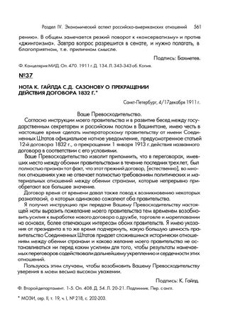 Нота К. Гайлда С.Д. Сазонову о прекращении действия договора 1832 г. Санкт-Петербург, 4/17 декабря 1911 г. // Ф. Второй департамент. 1-5. Оп. 408. Д. 54. Л. 20-21. Подлинник. Пер. с англ. МОЭИ, сер. II, т. 19, ч. I, № 218, с. 202-203.