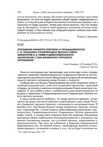 Отношение министра торговли и промышленности С.И. Тимашева управляющему делами Совета Министров Н.К. Плеве о целесообразности заключения с США временного торгового соглашения. Санкт-Петербург, 12/25 ноября 1912 г. // Ф. Второй департамент. 1-5. Оп. 408. Д. 54. Л. 212-212 об. Копия. ИА, 1956, № 6, док. № 6, с. 97.