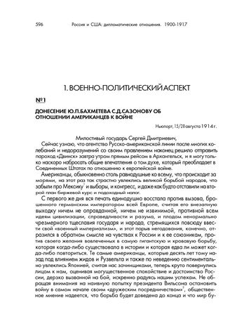 Донесение Ю.П. Бахметева С.Д. Сазонову об отношении американцев к войне. Ньюпорт, 15/28 августа 1914 г. // Ф. Канцелярия МИД. Оп. 470. 1914 г. Д. 49. Л. 1-4. Подлинник.
