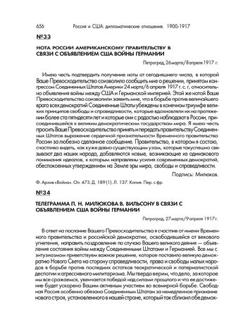 Нота России американскому правительству в связи с объявлением войны США Германии. Петроград, 26 марта/8 апреля 1917 г. // Ф. Архив «Война». Оп. 473. Д. 189 (1). Л. 137. Копия. Пер. с фр.
