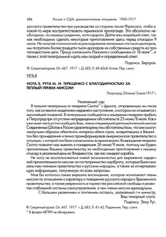 Нота Э. Рута М.И. Терещенко с благодарностью за теплый прием миссии. Петроград, 20 июня/3 июля 1917 г. // Ф. Секретный архив. Оп. 467. 1917 г. Д. 683. Л. 41-42. Подлинник. Пер. с англ.