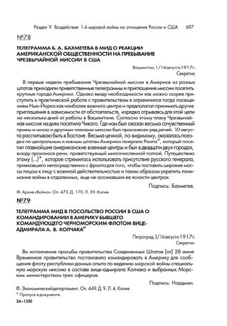 Телеграмма Б.А. Бахметева в МИД о реакции американской общественности на пребывание российской Чрезвычайной миссии в США. Вашингтон, 1/14 августа 1917 г. // Ф. Архив «Война». Оп. 473. Д. 170. Л. 39. Копия.