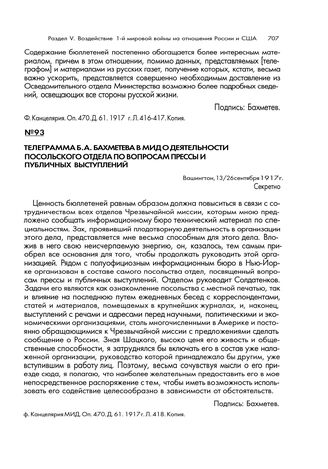 Телеграмма Б.А. Бахметева в МИД о деятельности посольского отдела по вопросам прессы и публичных выступлений. Вашингтон, 13/26 сентября 1917 г.