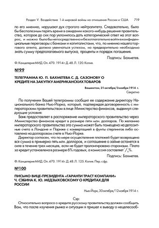 Письмо вице-президента «Гаранти Траст Компани» Ч. Сэбина К.Ю. Медзыховскому о кредитах для России. Нью-Йорк, 30 октября/12 ноября 1914 г. // Ф. Посольство в Вашингтоне. Оп. 512/1. Д. 356. Л. 16-17. Копия. Пер. с англ.