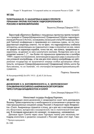 Донесение Н.В. Богоявленского А.К. Бентковскому о развитии российско-американской торговли через города Владивосток и Сиэтл. Сиэтл, 24 января/6 февраля 1915 г. // Ф. Экономический департамент. Оп. 452. Д. 503. Л. 1-5об. Подлинник.