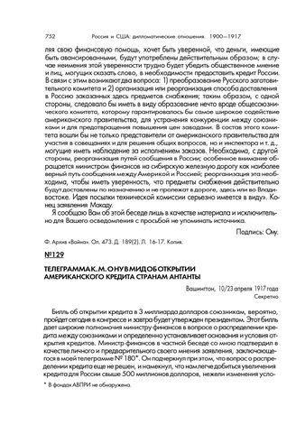 Телеграмма К.М. Ону в МИД об открытии американского кредита странам Антанты. Вашингтон, 10/23 апреля 1917 г.