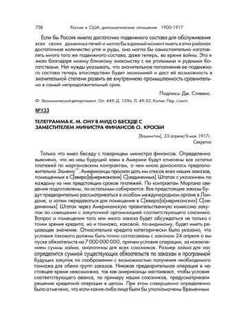 Телеграмма К.М. Ону в МИД о беседе с заместителем министра финансов О. Кросби. [Вашингтон], 23 апреля/6 мая 1917 г. // Ф. Канцелярия МИД. Оп. 470. 1917 г. Д. 61. Л. 147-148. Копия.