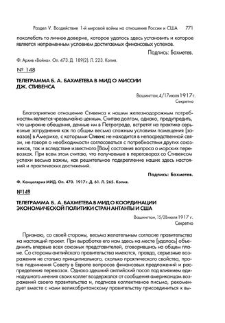 Телеграмма Б.А. Бахметева в МИД о координации экономической политики стран Антанты и США. Вашингтон, 15/28 июля 1917 г. // Ф. Экономический департамент. Оп. 449. Д. 129а. Л. 13-15. Копия.