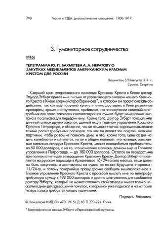Телеграмма Ю.П. Бахметева А.А. Нератову о закупках медикаментов Американским Красным Крестом для России. Вашингтон, 5/18 августа 1914 г. // Ф. Канцелярия МИД. Оп. 470. 1915 г. Д. 60. Л. 223-224. Копия.