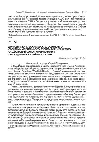 Донесение Ю.П. Бахметева С.Д. Сазонову о создании и деятельности Русско-Американского общества для сбора пожертвований пострадавшим от войны в России. Ньюпорт, 6/19 сентября 1915 г. // Ф. Канцелярия МИД. Оп. 470. 1915 г. Д. 62. Л. 27-28. Подлинник.