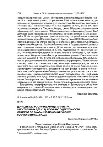 Донесение К.М. Ону товарищу министра иностранных дел С.Д. Боткину о деятельности Общества по оказанию помощи русским военнопленным в США. Вашингтон, 14/27 декабря 1916 г. // Ф. Второй департамент. Отдел о военнопленных. Оп. 708. Д. 1549. Л. 11-13. Подлинник. 1 копия.