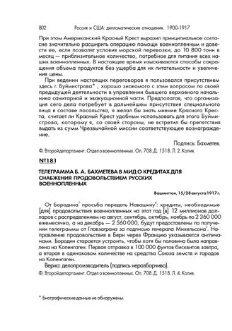 Телеграмма Б.А. Бахметева в МИД о кредитах для снабжения продовольствием русских военнопленных. Вашингтон, 15/28 августа 1917 г.