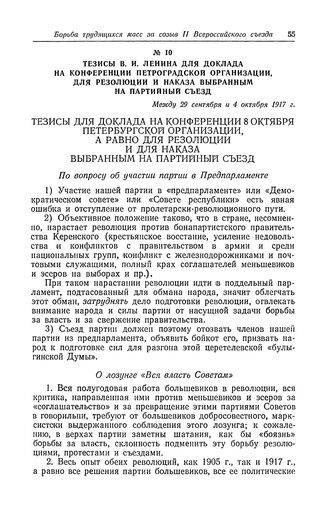 Тезисы В. И. Ленина для доклада на конференции Петроградской организации, для резолюции и наказа выбранным на партийный съезд. Между 29 сентября и 4 октября 1917 г. // В. И. Ленин, Соч., т. 26, стр. 116—118.