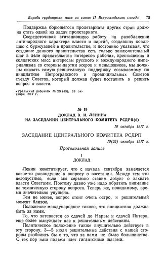 Доклад В. И. Ленина на заседании Центрального Комитета РСДРП(б). 10 октября 1917 г. // В. И. Ленин, Соч., т. 26, стр. 160—161.