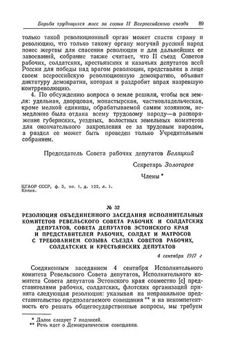 Резолюция объединенного заседания исполнительных комитетов Ревельского Совета рабочих и солдатских депутатов, Совета депутатов Эстонского края и представителей рабочих, солдат и матросов с требованием созыва съезда Советов рабочих, солдатских и крестьянских депутатов. 4 сентября 1917 г. // ЦГАВМФ, ф. р-661, оп. 1, д. 110, л. 29. Телеграфный бланк.