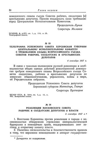 Телеграмма Успенского Совета Херсонской губернии Центральному Исполнительному Комитету с требованием созыва Всероссийского съезда Советов рабочих, солдатских и крестьянских депутатов. 4 сентября 1917 г. // ЦГАОР СССР, ф. 1244, оп. 1, д. 13, л. 462. Заверенная копия.