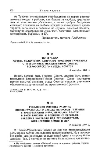 Телеграмма Совета солдатских депутатов Томского гарнизона с требованием немедленного созыва Всероссийского съезда Советов. 8 сентября 1917 г. // ЦГАОР СССР, ф. 6978, оп. 1, д. 358, л. 58. Копия.