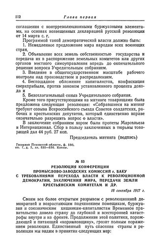 Резолюция конференции промыслово-заводских комиссий г. Баку с требованиями перехода власти к революционной демократии, заключения мира, передачи земли крестьянским комитетам и др. 18 сентября 1917 г.
