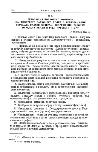 Резолюция полкового комитета 3-го пехотного запасного полка с требованиями перехода власти Советам, вооружения рабочих, передачи земли в руки крестьян и др. 18 сентября 1917 г.