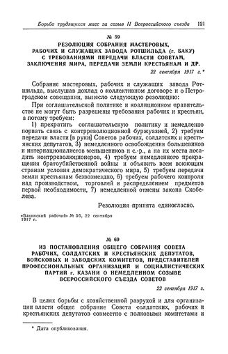 Резолюция собрания мастеровых, рабочих и служащих завода Ротшильда (г. Баку) с требованиями передачи власти Советам, заключения мира, передачи земли крестьянам и др. 22 сентября 1917 г. // «Бакинский рабочий» № 56, 22 сентября 1917 г.