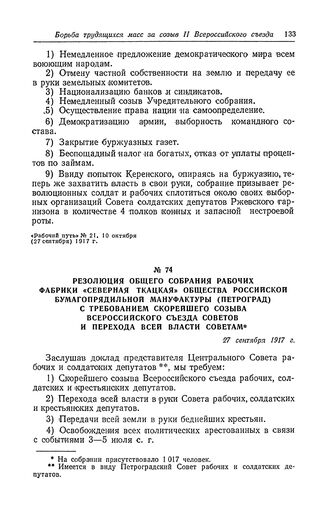 Резолюция общего собрания рабочих фабрики «Северная ткацкая» общества Российской бумагопрядильной мануфактуры (Петроград) с требованием скорейшего созыва Всероссийского съезда Советов и перехода всей власти Советам. 27 сентября 1917 г.