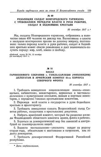 Резолюция солдат Новгородского гарнизона с требованием передачи власти в руки рабочих, солдат и беднейших крестьян. 30 сентября 1917 г. // «Рабочий путь» № 24, 13 октября (30 сентября) 1917 г.