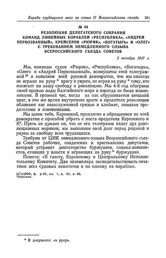 Резолюция делегатского собрания команд линейных кораблей «Республика», «Андрей Первозванный», крейсеров «Рюрик», «Богатырь» и «Олег» с требованием немедленного созыва Всероссийского съезда Советов. 2 октября 1917 г. // ЦГАВМФ, ф. р-95, оп. 1, д. 35, л. 89. Черновик.