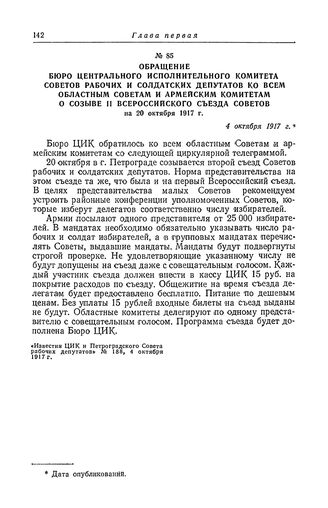 Обращение Бюро Центрального Исполнительного Комитета Советов рабочих и солдатских депутатов ко всем областным Советам и армейским комитетам о созыве II Всероссийского съезда Советов на 20 октября 1917 г. 4 октября 1917 г. // «Известия ЦИК и Петроградского Совета рабочих депутатов» № 188, 4 октября 1917 г.