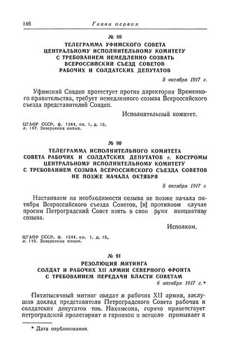 Телеграмма исполнительного комитета Совета рабочих и солдатских депутатов г. Костромы Центральному Исполнительному Комитету с требованием созыва Всероссийского съезда Советов не позже начала октября. 5 октября 1917 г. // ЦГАОР СССР, ф. 1244, оп. 1, д. 15, л. 145. Заверенная копия.