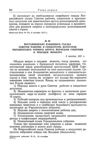 Постановление районного съезда Советов рабочих и солдатских депутатов Лысьвенского горного округа Пермской губернии о текущем моменте. 8 октября 1917 г. // «Уральский рабочий» № 21, 22 октября 1917 г.
