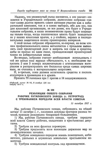 Резолюция общего собрания рабочих Путиловского завода (г. Петроград) с требованием передачи всей власти Советам. 11 октября 1917 г. // «Рабочий путь» № 35, 26 (13) октября 1917 г.