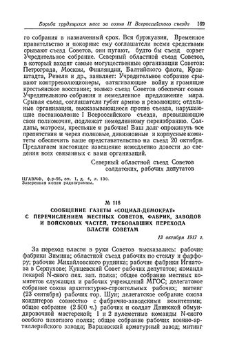 Сообщение газеты «Социал-Демократ» с перечислением местных Советов, фабрик, заводов и войсковых частей, требовавших перехода власти Советам. 13 октября 1917 г.